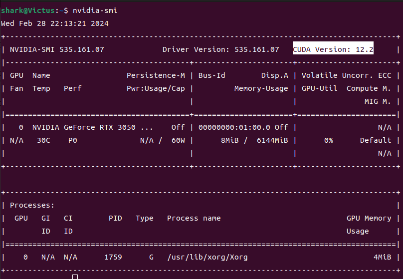 다음 이미지와 같이 nvidia-smi 명령을 통해서 살펴보면 현재 사용하고 있는 Driver와 호환이 잘 되는 CUDA version을 확인할 수 있습니다. 이는 추천해주는 것뿐이라서 현재 설치되어 사용하고 있는 CUDA의 버전을 이야기하는 것이 아닙니다.