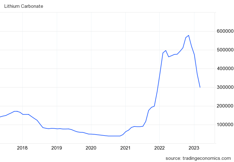 중국의 탄산리튬 가격은 3월에 톤당 30만 위안 아래로 떨어지며 14개월 만에 최저치를 기록했으며, 견조한 생산량과 수요 감소가 올해 공급 과잉에 대한 예측을 뒷받침하면서, 역사적으로 리튬은 2022년 12월에 사상 최고치인 57만 위안을 기록한 후 당시의 절반 가격으로 떨어졌습니다.