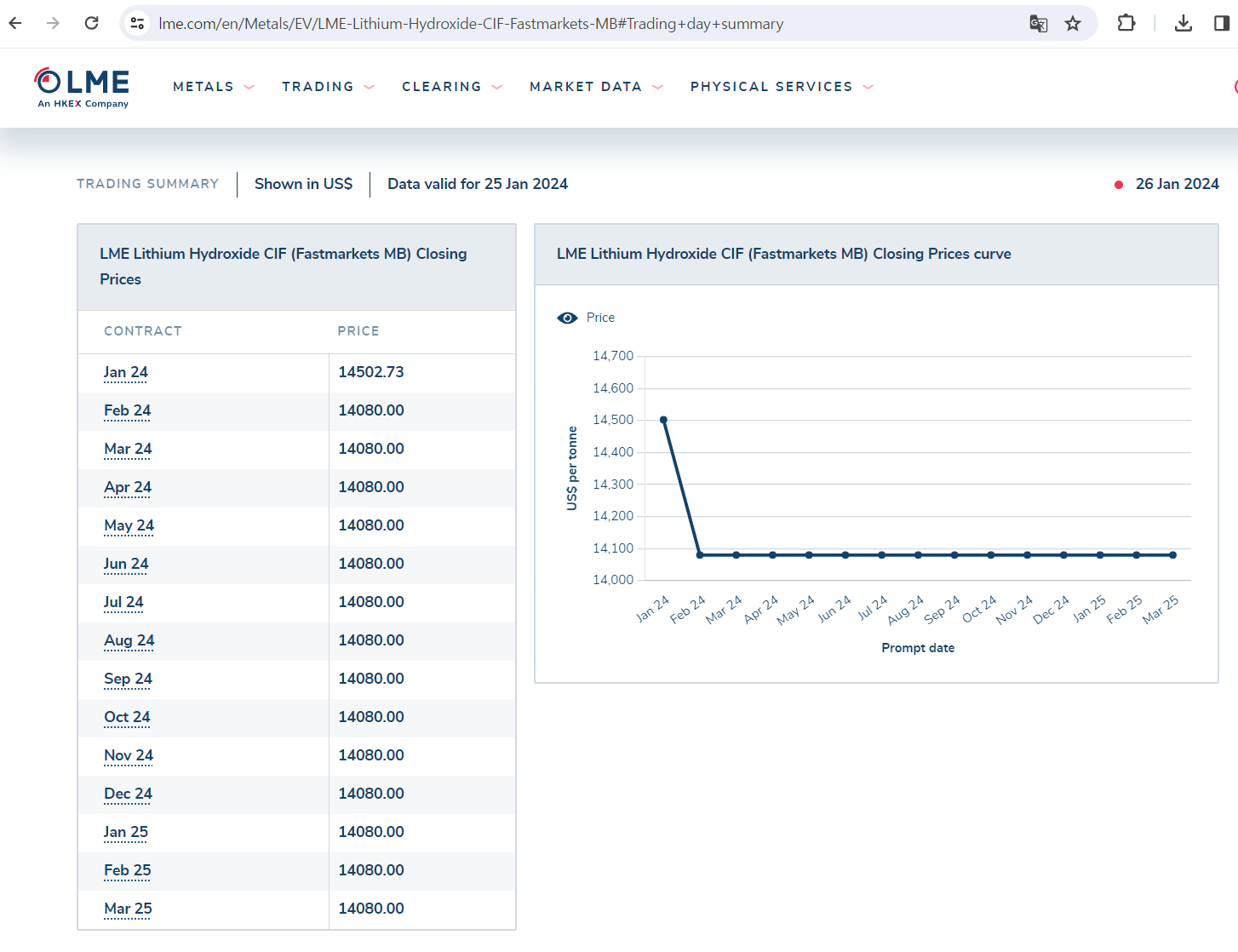 세계 최대의 비철금속 거래소로, 리튬의 선물 가격을 제공합니다. LME 웹사이트에 접속하면, 상단 메뉴에서 "METALS"를 클릭한 후, EV에서 "LME Lithium Hydroxide CIF (Fastmarkets MB)"를 선택합니다. 그러면, 리튬의 선물 가격을 확인할 수 있습니다.