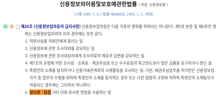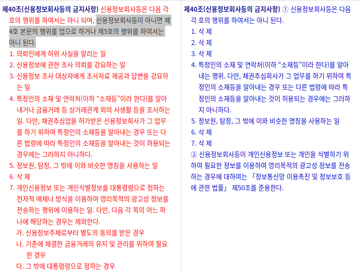기존 신용정보법 제40조 제4호, 제5호의 내용은 신용정보회사(채권추심업자 등) 등이 아니면 특정인의 소재 및 연락처를 알아내거나 금융거래 등 상거래 관계 외의 사생활 등의 조사를 금지하고 위반 시 처벌하도록 하고 있었습니다.