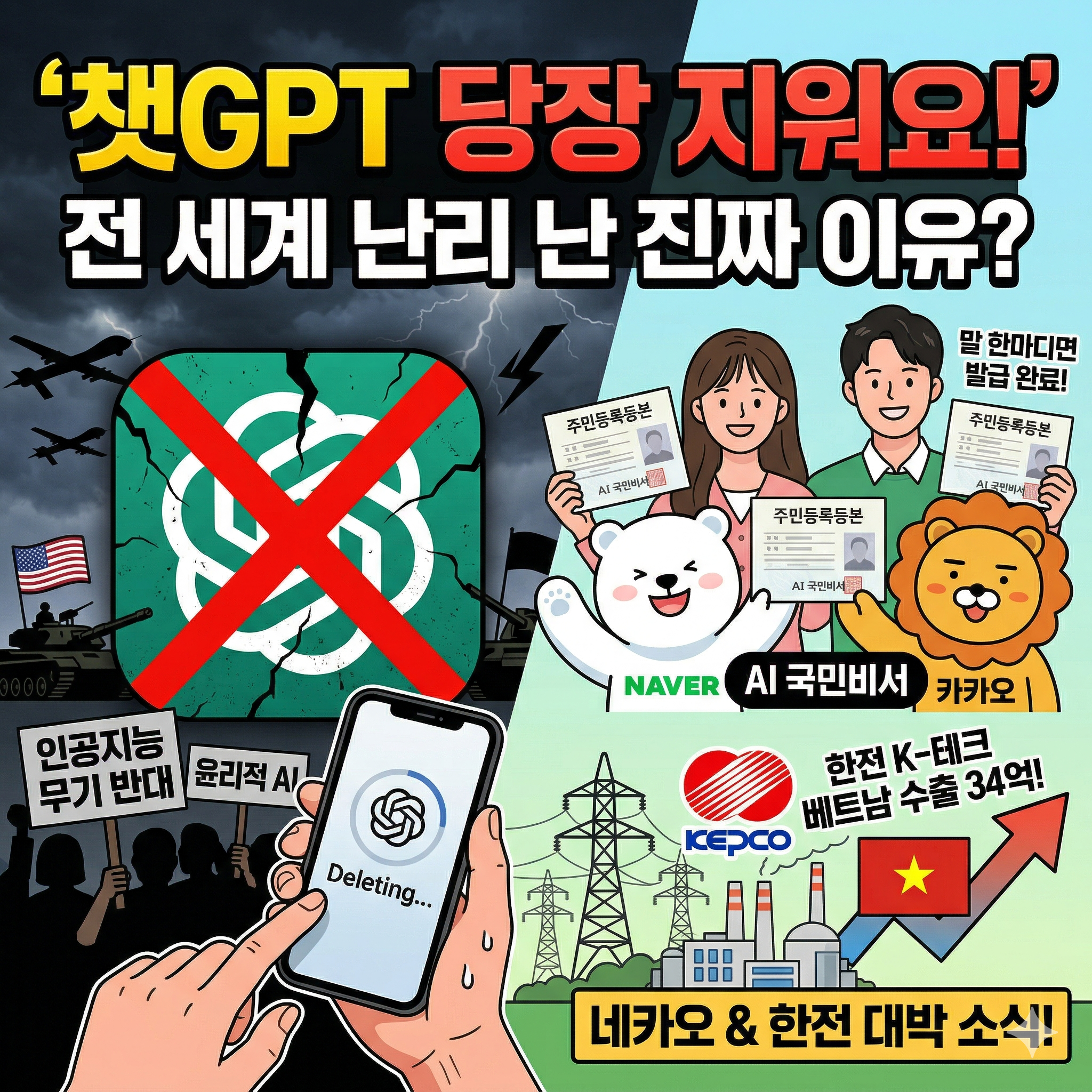 오늘은 우리 일상을 180도 바꿔놓을 초대박 국내 AI 서비스 소식부터, 전 세계를 발칵 뒤집어 놓은 '챗GPT 삭제 운동'의 전말, 그리고 대한민국 공기업의 자랑스러운 AI 수출 쾌거까지! 가장 핫하고 흥미로운 AI 소식 4가지를 쏙쏙 뽑아 한 편의 스토리로 엮어왔습니다.
