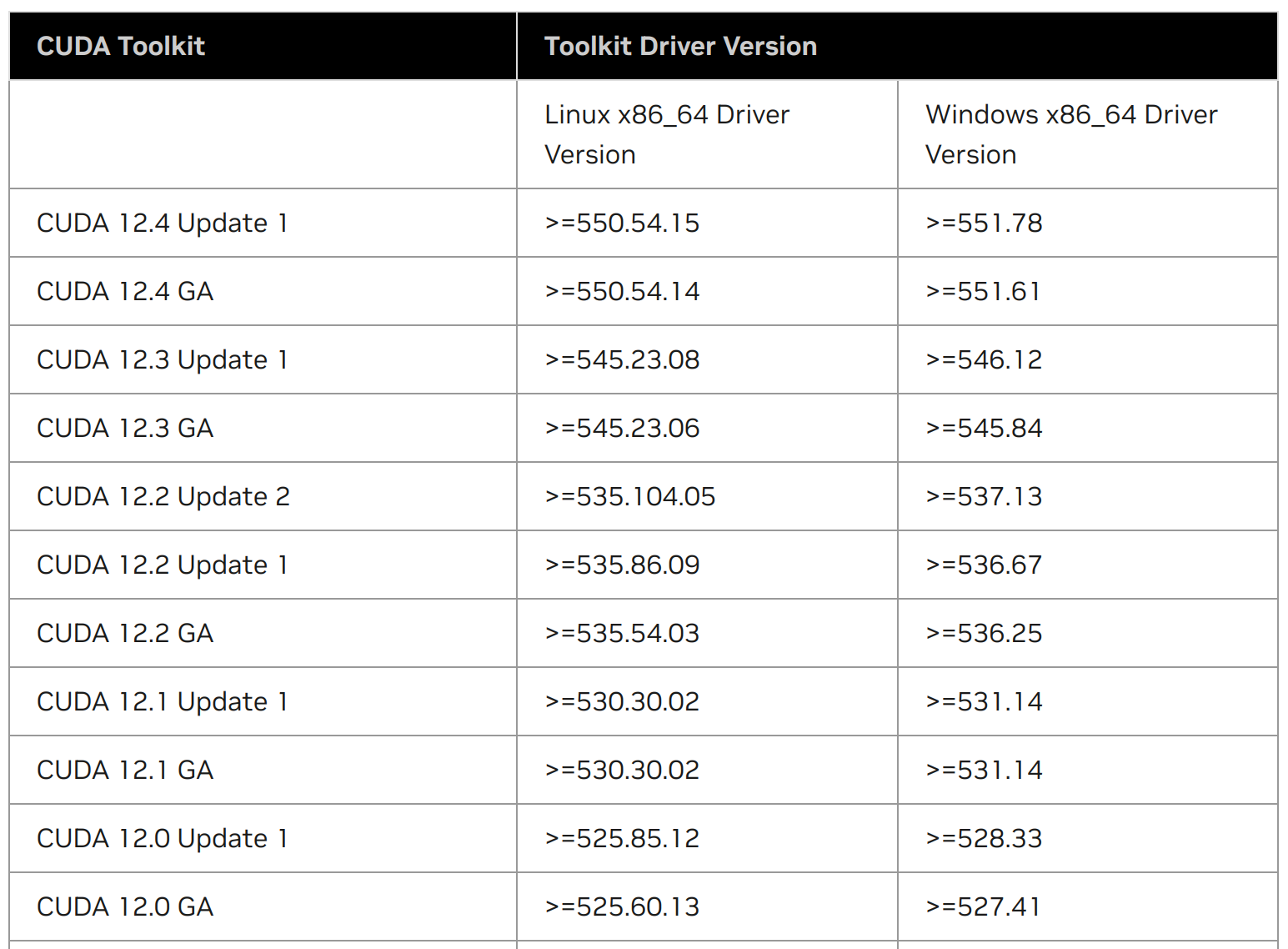 https://docs.nvidia.com/cuda/cuda-toolkit-release-notes/index.html 에서 CUDA 버전 호환성을 위해 필요한 최소 드라이버 버전은 다음과 같습니다.