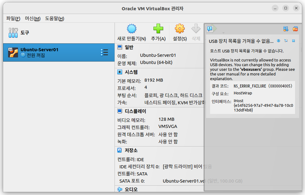 우분투 환경에서 VirtualBox 실행 시 USB 장치 에러 해결 방법