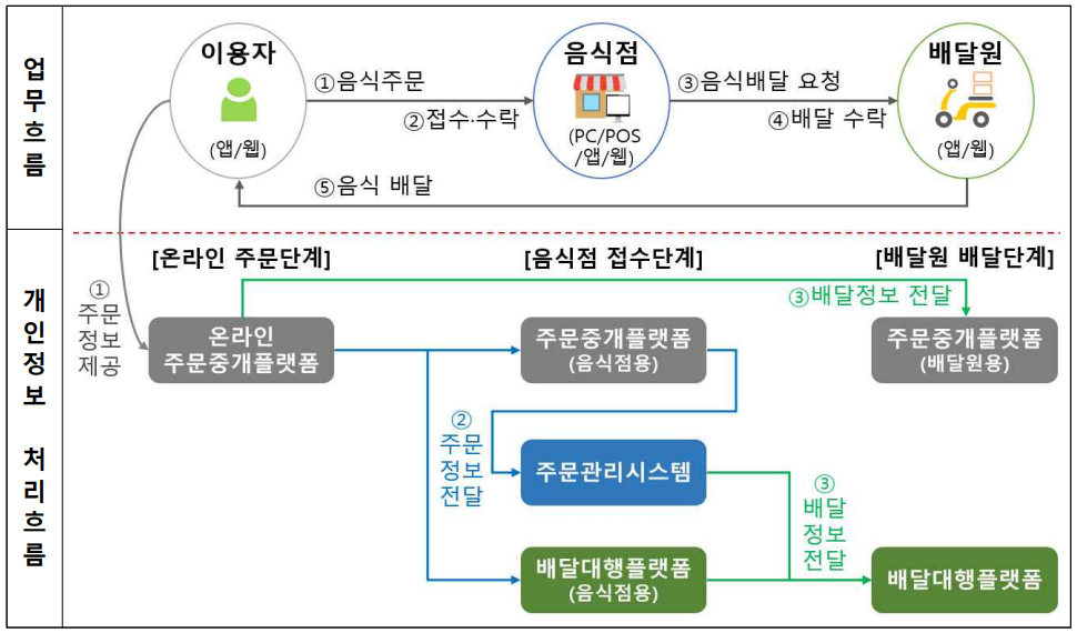 주문배달 서비스는 이용자가 음식을 주문하는 주문중개 플랫폼, 음식점이 주문을 관리하는 주문통합관리 시스템, 음식점과 배달원을중개하는 배달대행 플랫폼의 각 시스템 간 개인정보가 공유·전달되고, 그 과정에서 음식점주와 종업원, 배달원과 지역배달사무소등의 다양한 관계자가 이용자의 개인정보를 처리하는 복잡한 개인정보처리 흐름을 가지고 있습니다.