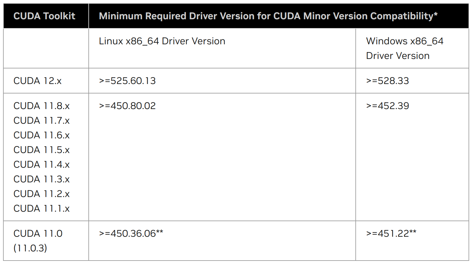 Driver 별 CUDA Toolkit 버전 호환성을 확인합니다. CUDA 마이너 버전 호환성을 위해 필요한 최소 드라이버 버전은 다음과 같습니다. CUDA 마이너 버전 호환성은 https://docs.nvidia.com/deploy/cuda-compatibility/index.html 에 자세히 설명되어 있습니다.